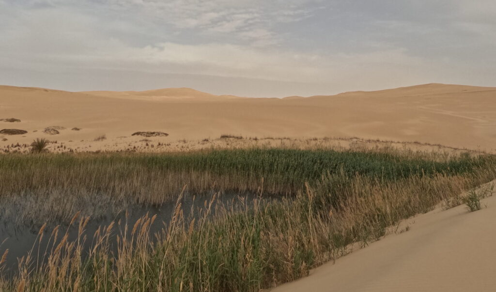 Our first stop was at a small lake that was hidden a couple of kilometers into the desert. This is the point, that in Google Maps, is marked as „Cold Spring“ for reference. It looks like how you’d normally expect a Fata Morgana to look like. It is basically a small valley between the dunes, where out of nowhere reeds begin to grow in the sand, followed by the lake. The phenomenon is entirely natural, having to do with the complex network of thermal springs below the sand. Basically, this point of desert is low enough, so that a water carrying layer of earth is exposed creating a lake where none should be.