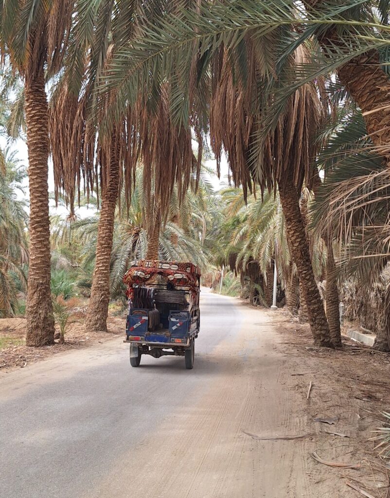 In Siwa there exists no public transportation. You can either walk, which is a good option, if your accomodation is in Siwa Town itself, or you can take taxi. Local taxis are basically small trycicles, with a cargo hold in the back, where passengers are sitting. There will be a swarm of drivers waiting when you leave the bus, but they quote quite high prices. The normal taxi stand is here. As tourists, the driver will try to charge you a high price first. Haggle a bit. We usually paid around 100 EGP or 1,7€ for the ride to our accomodation, which was roughly 7km out of town.