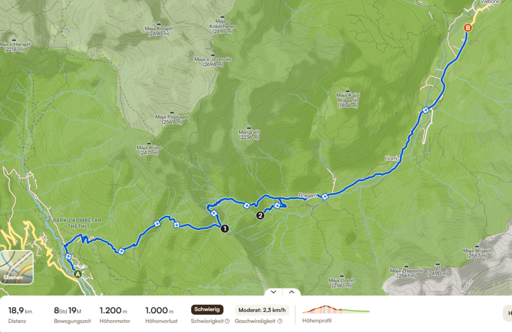 The time and distance stated here are regarding the shortest route from the center of Theth to the first guesthouses in Valbona. Your hike will most likely be longer, as you will start somewhere in the Theth valley, where your guesthouse is and the walk towards the starting point must be added on top. Also, depending on your guesthouse in Valbona there can be quite some distance to add in the end. We met one girl on our way towards Valbona, who had another hour to go after we reached our accomodation for the night. Both villages are spread out very far so keep that in mind. In the route I created I chose the bus stop as the starting point, as many people will come by bus from Shkodra and immediatly want to start the hike from there.